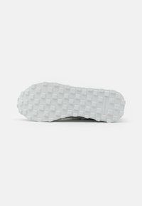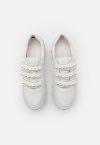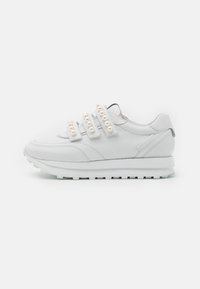Baskets blanches en cuir avec accents de perles, fermetures à sangle, semelle texturée et bout arrondi ; portées avec un pantalon noir fuselé pour le contraste.
