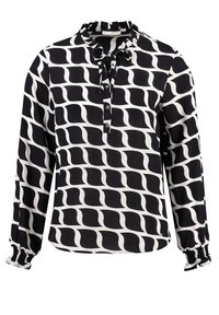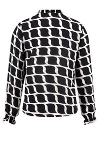 Blouse à manches longues noire et blanche à motifs, avec col à volants, patte de boutonnage sur le devant et poignets élastiques.