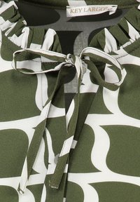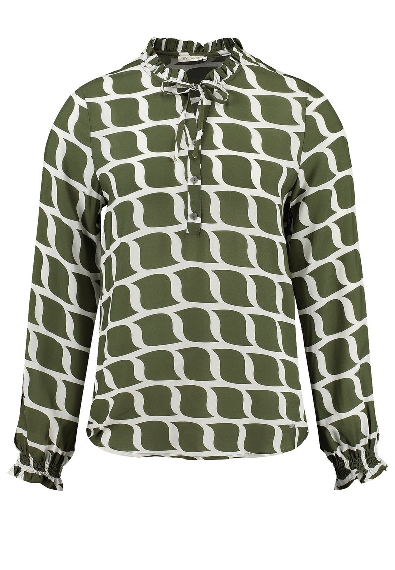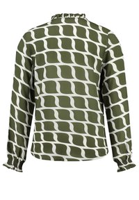 Blouse à manches longues avec motif abstrait de vagues vert olive et blanc, col à volants avec nœud, patte de boutonnage et poignets smockés.