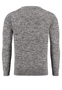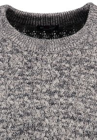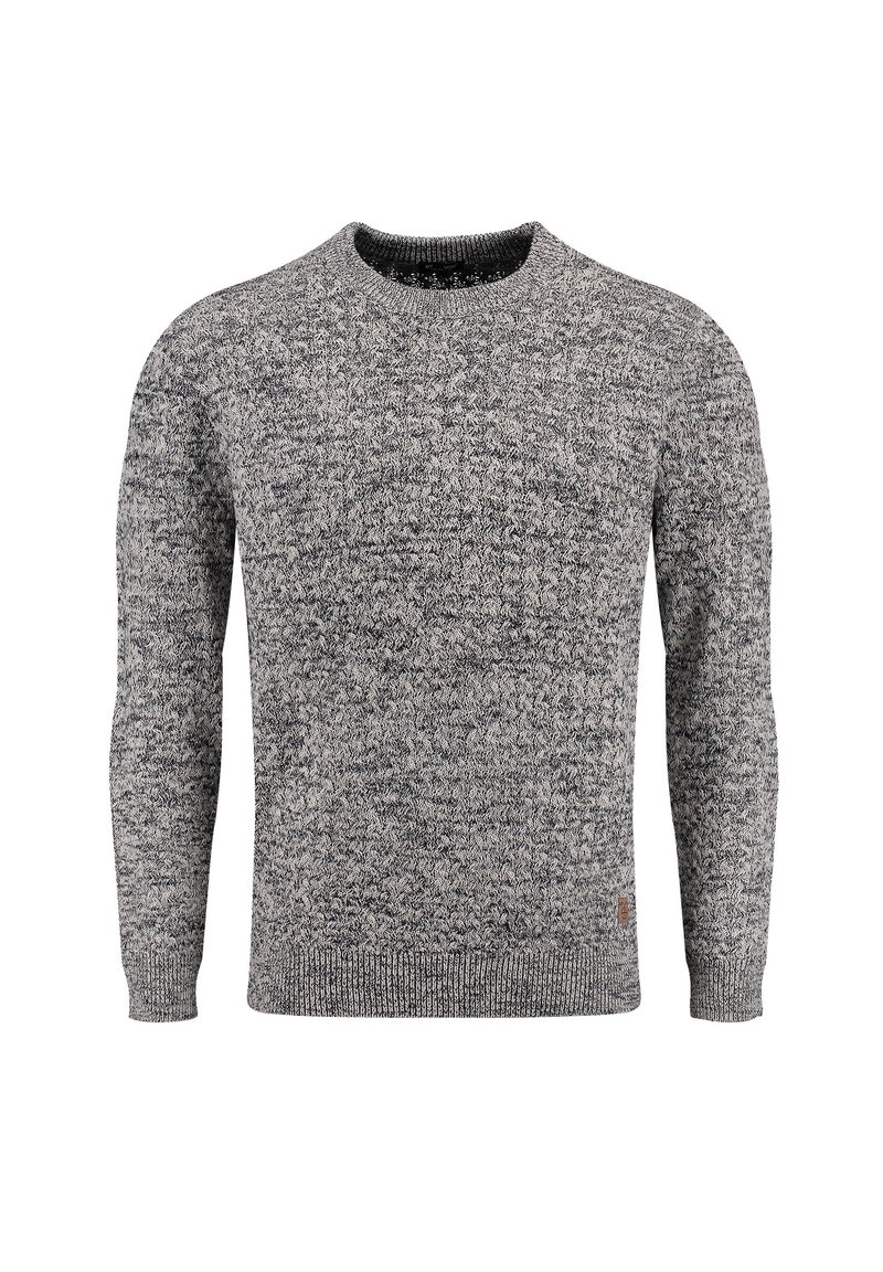Pull en maille grise avec un motif texturé, col rond, manches longues et poignets côtelés. Présente une petite étiquette marron en bas à gauche.