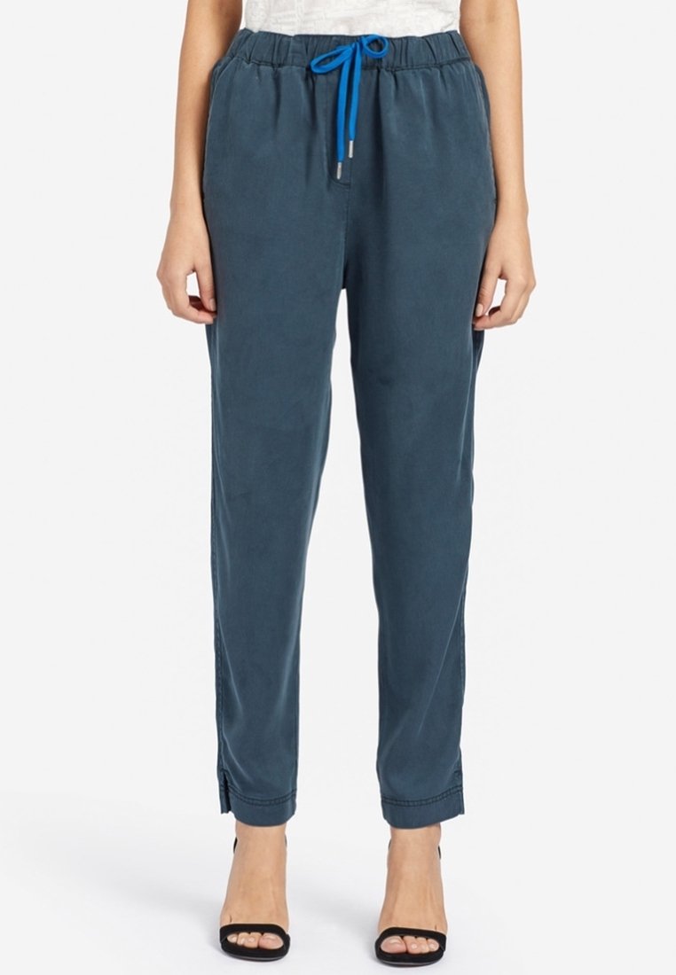 Femme portant un pantalon à cordon de serrage bleu marine et des escarpins noirs ouverts, debout devant un fond blanc.