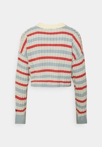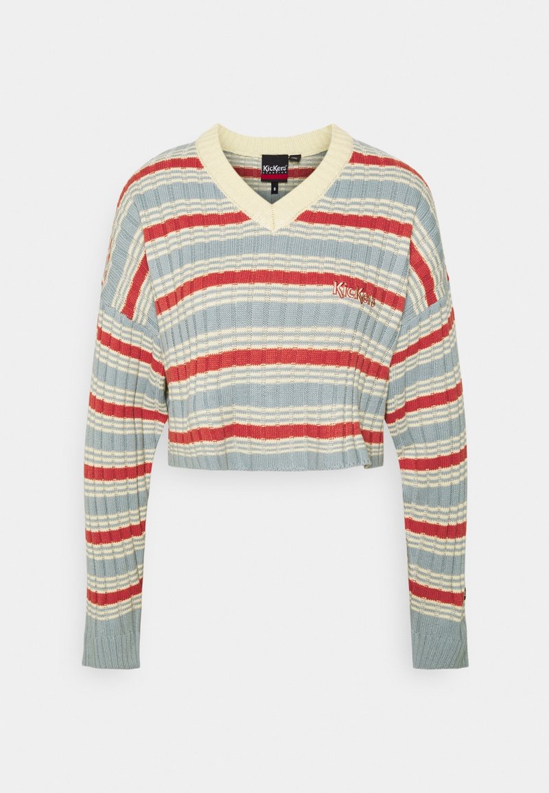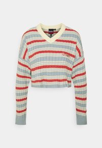 Pull cropped rayé en bleu clair, rouge et crème. Il présente un col en V, une texture côtelée et un logo brodé sur la poitrine gauche.