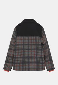 Veste à carreaux avec une épaule et une capuche noires, dotée de deux poches poitrine, de zips sur les côtés et d'accents orange aux poignets. Tissu texturé.