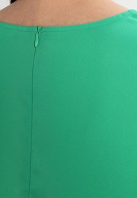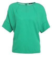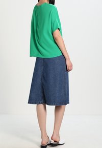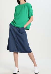 Haut vert à manches courtes, tissu léger, col rond, coupe ample, avec manches raglan et drapé subtil, associé à une jupe en denim.