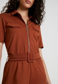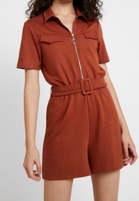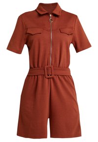 Combinaison à manches courtes de couleur rouille, en tissu doux. Elle comprend une fermeture éclair sur le devant, deux poches poitrine et une taille ceinturée.