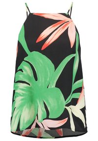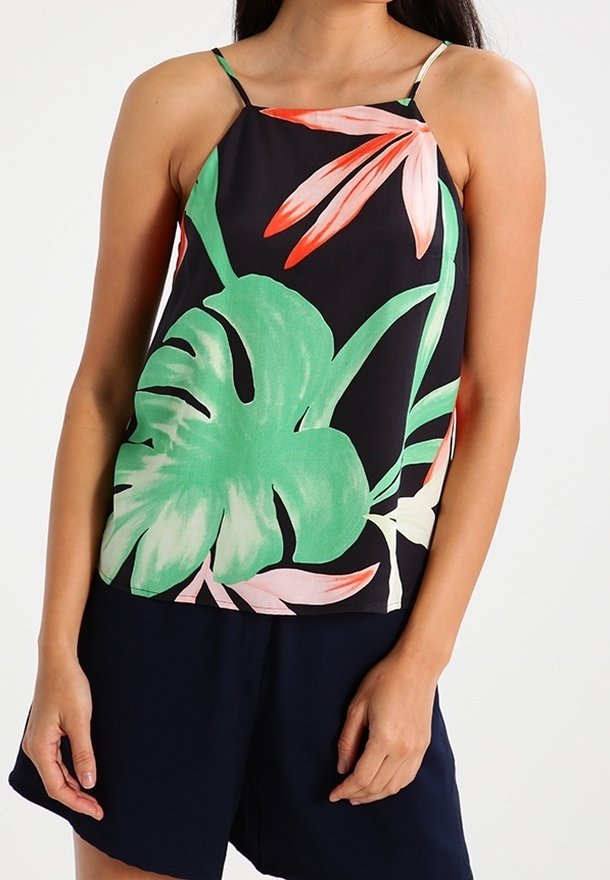 Caraco à imprimé floral avec des feuilles vertes et des fleurs roses sur fond noir. Confectionné en tissu léger, il est doté de fines bretelles réglables.