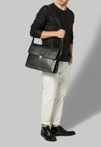 Sac en cuir noir à rabat et fermoir en métal, doté d'une bandoulière, associé à un pantalon blanc et des chaussures noires.