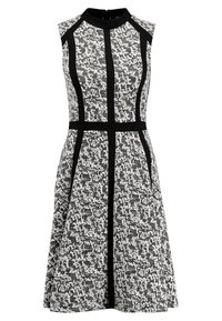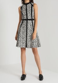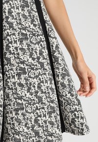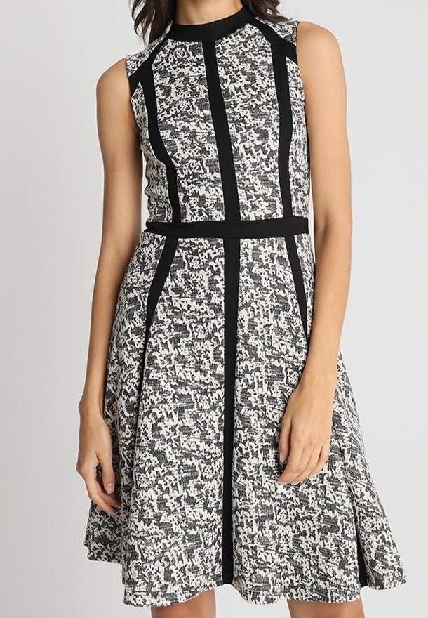 Robe sans manches à motifs noir et blanc avec des rayures noires verticales et horizontales, taille cintrée et jupe évasée portée par une femme.