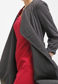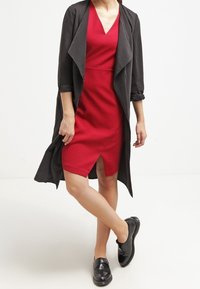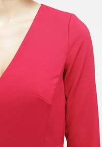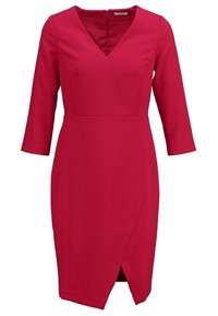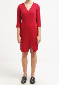 Robe rouge cintrée avec un col en V, des manches trois-quarts et une fente à l'avant. Confectionnée en tissu lisse avec des détails de couture structurée.