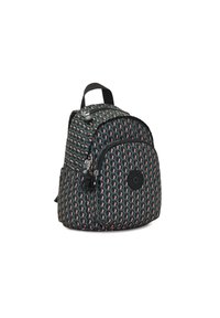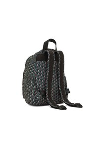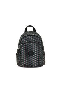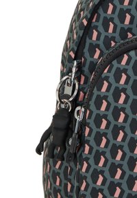 Sac à dos noir avec un motif orné d'accents roses, forme arrondie, compartiments zippés et une poignée supérieure pour le transport.