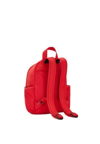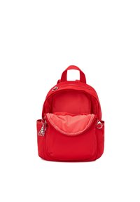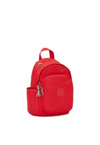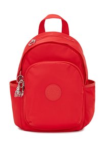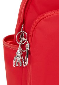 Petit sac à dos rouge avec poche zippée à l'avant, poches latérales, poignée supérieure, et un porte-clés singe argenté accroché à la fermeture éclair avant.