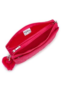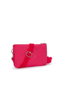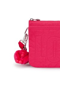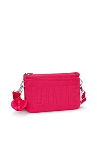 Petit sac bandoulière rose vif avec "LOVE" brodé sur le devant et un porte-clés en forme de singe en peluche attaché à la sangle.