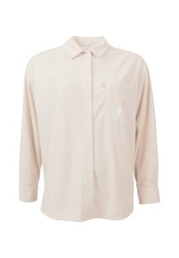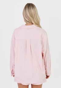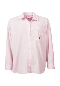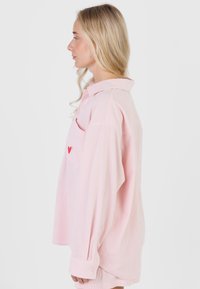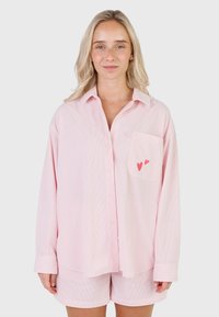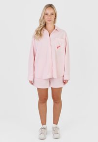 Femme aux cheveux blonds portant une chemise rose clair à boutons avec deux petits cœurs rouges sur la poche poitrine et un short assorti.