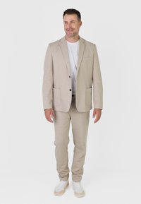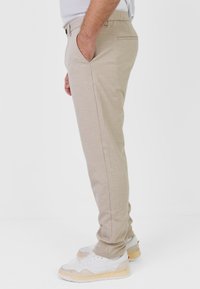 Homme portant un pantalon beige ajusté, des baskets blanches et un t-shirt blanc, avec une main dans la poche et l'autre détendue le long du corps.