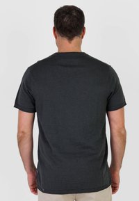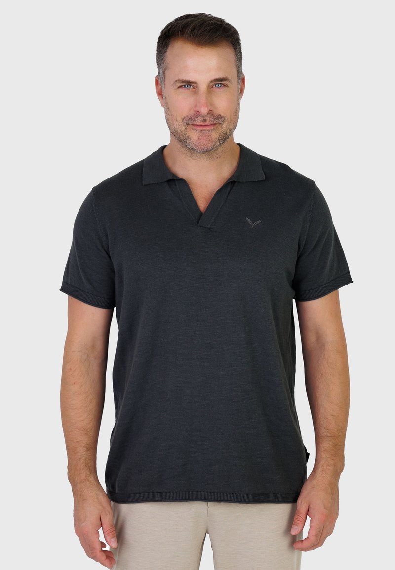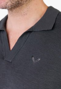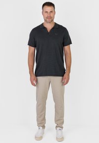 Homme aux cheveux bruns courts et à la légère barbe, portant un polo noir à manches courtes et un pantalon beige, debout devant un fond uni.