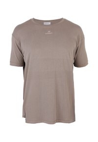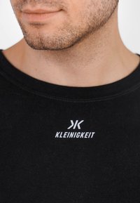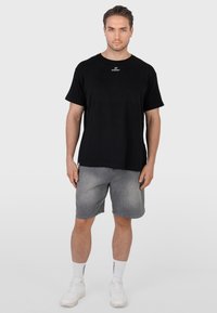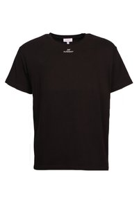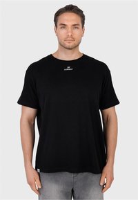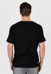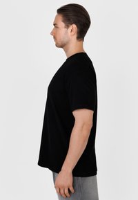 Homme portant un t-shirt noir uni avec un petit logo blanc au centre de la poitrine, associé à un pantalon gris, debout devant un fond uni.