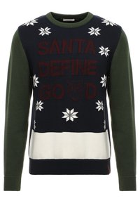 Pull de Noël bleu marine et vert avec flocons de neige blancs, bande inférieure blanche, et texte "Santa Define Good" accompagné d'un graphique de hibou.