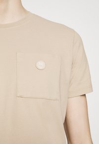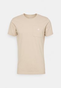 T-shirt beige à manches courtes en coton avec une poche poitrine arborant un badge logo circulaire. Texture lisse et coupe décontractée.