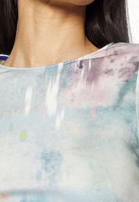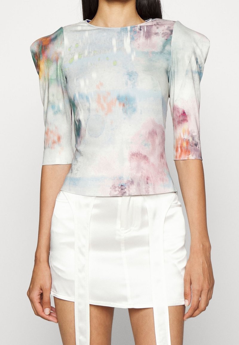 Haut ajusté avec épaulettes, conçu dans des couleurs claires avec des motifs abstraits ; texture lisse ; associé à une mini-jupe blanche brillante.