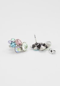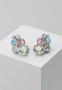 Groupe de boucles d'oreilles rondes multicolores en pierres précieuses, dans des tons pastel de vert, rose, bleu et violet, sur un bloc d'exposition blanc.