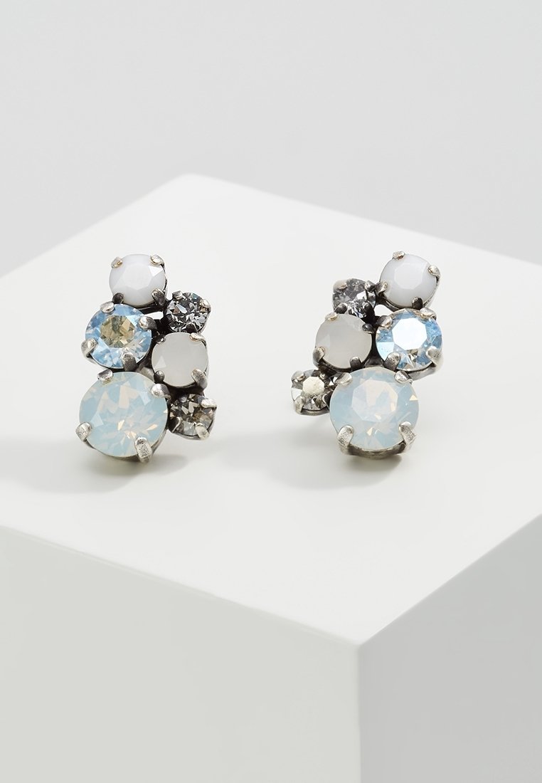 Boucles d'oreilles clous regroupées avec des pierres précieuses rondes, facettées, bleues, blanches et transparentes, montées sur métal couleur argent.