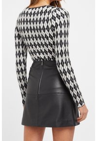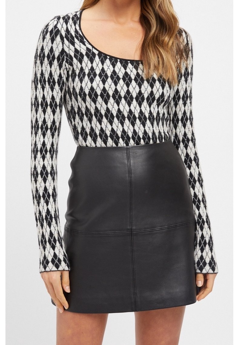 Femme portant un haut à manches longues noir et blanc à motif losanges, rentré dans une minijupe en cuir noir, debout devant un fond uni.