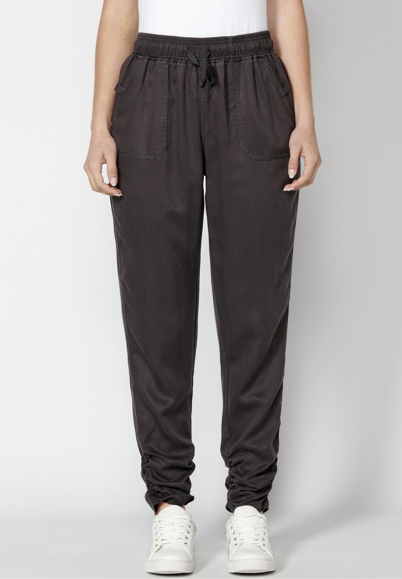 Pantalons gris foncé à taille élastique avec deux poches avant, poignets fuselés et une texture douce, associés à des baskets blanches.