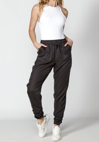 • Pantalons noirs à cordon de serrage avec une taille élastique, dotés de poches latérales et d'une coupe décontractée. Portés avec des sandales noires plates.