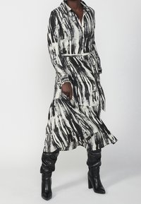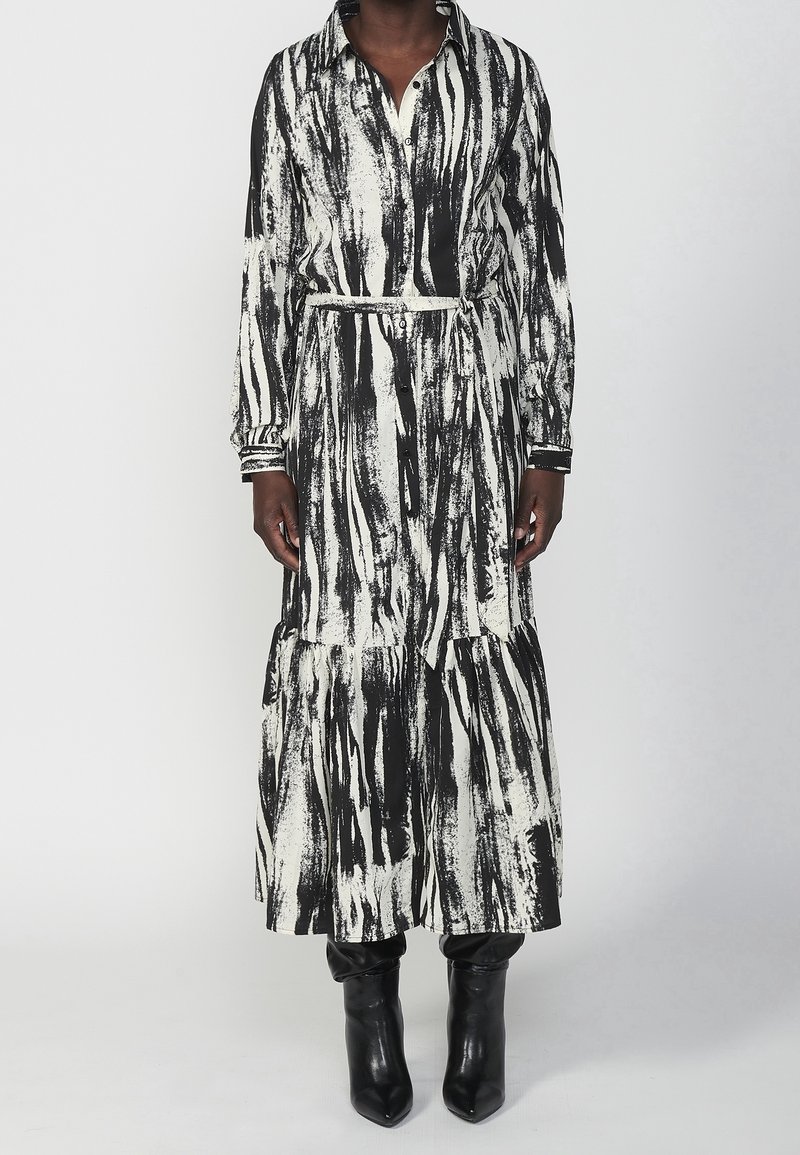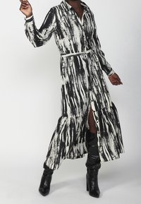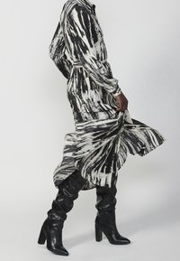 Robe longue rayée noir et blanc avec un devant à boutons, une jupe à volants froncée et une ceinture en tissu assortie. Portée avec des bottes noires jusqu'aux genoux.