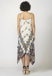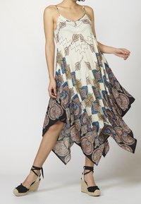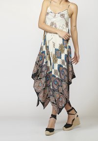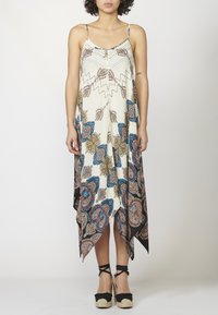 Robe légère sans manches avec un motif paisley tourbillonnant en bleu, orange et noir, dotée d'un ourlet fluide et de bretelles délicates.