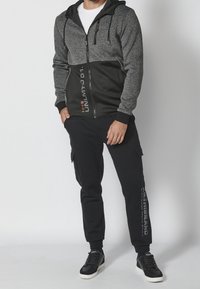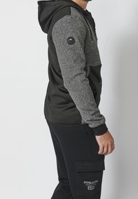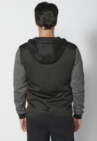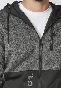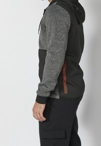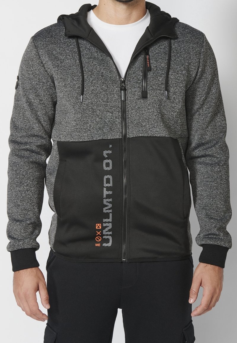 Sweat à capuche zippé gris et noir avec capuche, comportant une section supérieure texturée, une section inférieure lisse, et un logo orange près de la fermeture éclair.