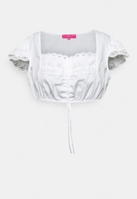 Top blanc court avec des détails en dentelle autour de l'encolure, manches courtes et taille froncée avec un lien en ruban. Texture en coton lisse.