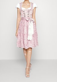 Robe dirndl avec une jupe lilas clair ornée de motifs floraux en dentelle, un corsage ajusté, des manches blanches de blouse et un nœud en satin à la taille.