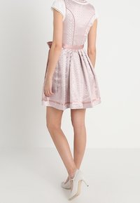 Femme portant une robe dirndl rose avec un chemisier en dentelle blanche, un tablier brodé de fleurs, un nœud de taille en satin et un collier ras du cou.