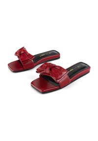 Sandale à glisser en cuir rouge avec une semelle plate, une large bande avec un détail froncé sur le dessus et une semelle intérieure noire élégante.