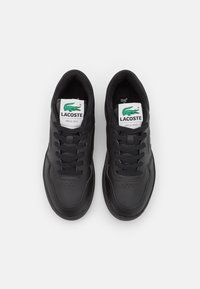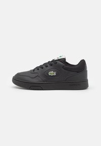 Baskets noires Lacoste avec étiquettes blanches sur la langue et logo crocodile vert portées aux pieds sur un fond clair uni.