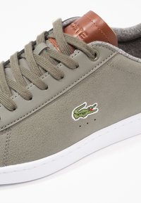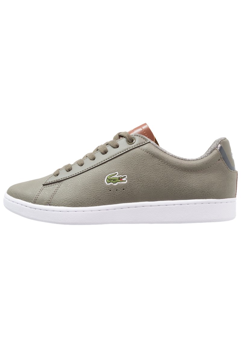 Baskets lacées en cuir vert olive avec semelle en caoutchouc blanc, présentant un petit logo crocodile vert et une languette de talon marron.