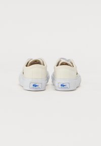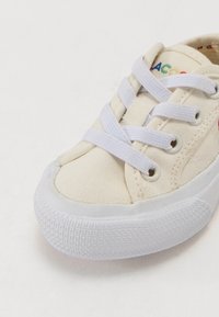 Baskets en toile blanches à profil bas, avec une fermeture lacée, une semelle en caoutchouc texturée et un motif brodé de rainbow et de soleil.