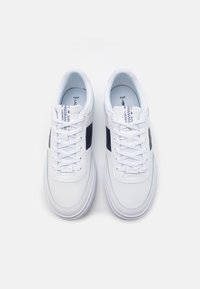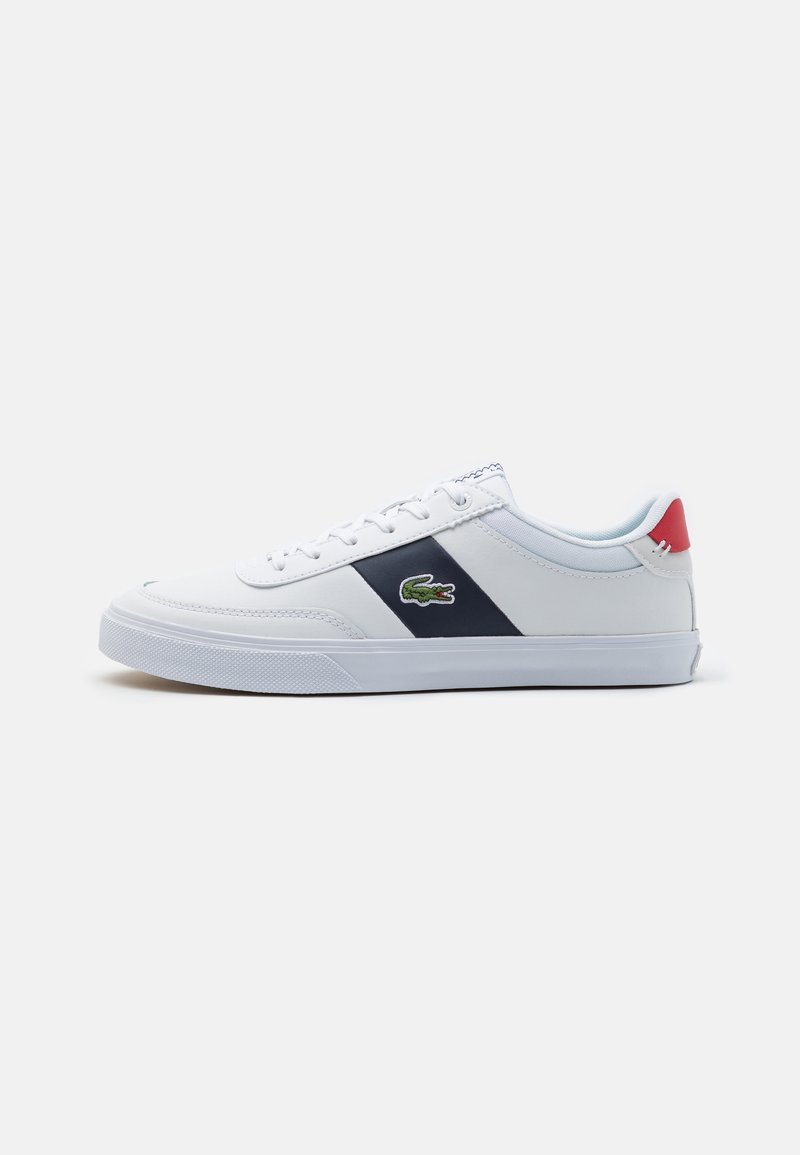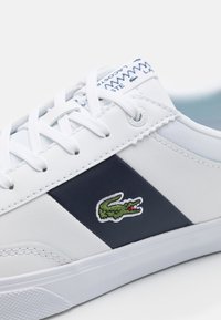 Basket blanche avec une bande diagonale marine, semelle en caoutchouc et logo brodé vert. Présente un accent rouge au talon et un design à lacets.