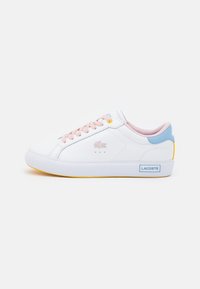 Baskets blanches avec des accents bleus, jaunes et roses, dotées d'une tige texturée, d'un design à lacets et d'un logo sur le côté.