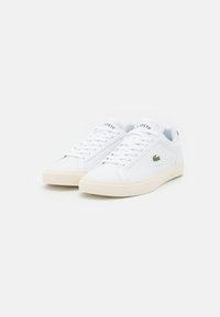 Baskets en cuir blanc à basse coupe, dotées d'une semelle en caoutchouc texturée, d'un bout arrondi, et d'un logo crocodile vert sur le côté.