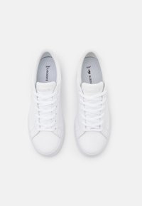 Baskets en cuir blanc à texture lisse, dotées d'un design profil bas et d'une fermeture à lacets. Un petit logo Lacoste vert est visible sur le côté.