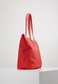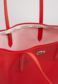 Sac fourre-tout rouge avec doubles anses d'épaule et petit logo crocodile vert sur le devant, posé sur un socle blanc.