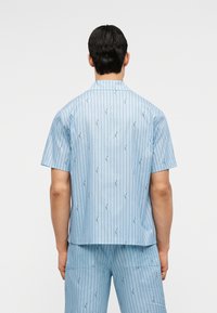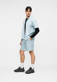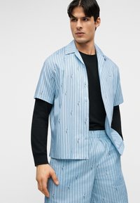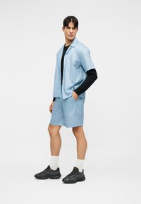 Homme portant une chemise à manches courtes rayée bleu clair et un short assorti par-dessus un haut noir à manches longues, debout devant un fond uni.