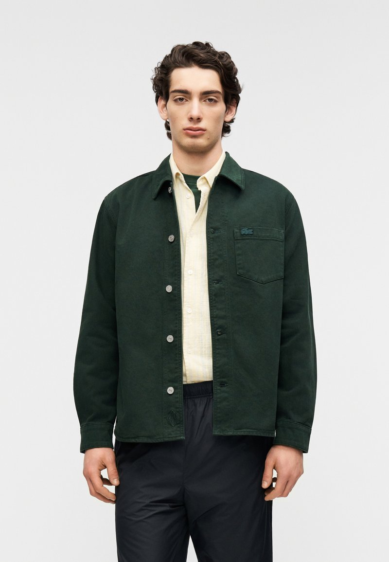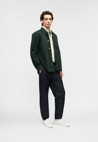 Veste en toile vert foncé avec une fermeture à boutons, un col et une poche poitrine. Portée sur une chemise jaune clair, associée à un pantalon noir.