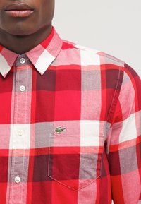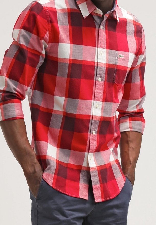 Homme portant une chemise à carreaux rouge, blanche et grise à manches longues retroussées et un pantalon bleu marine, les mains dans les poches.