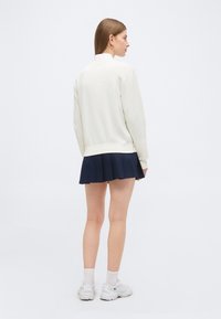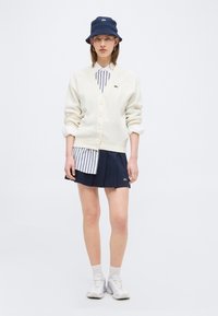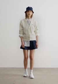 Jeune femme portant un chapeau seau bleu marine, un cardigan blanc boutonné sur une chemise à rayures bleues, et une jupe plissée bleu marine avec des logos de marque.
