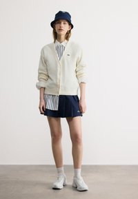 Cardigan à col en V en point de riz offre douceur et style rétro. Coupe courte et ample avec des détails modernes pour un look frais.