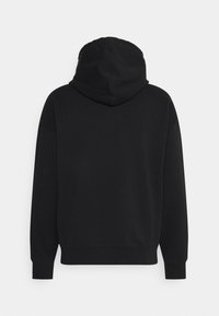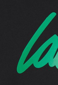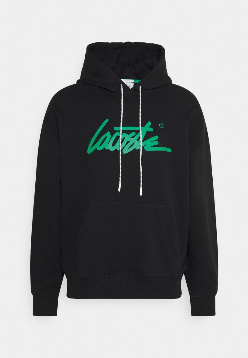 Sweat à capuche noir avec logo Lacoste vert, cordons de serrage blancs et bleus, poche kangourou à l'avant, et poignets et ourlet côtelés.