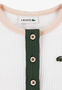 Ensemble de vêtements pour enfants en trois pièces : cardigan blanc côtelé avec boutons verts, body polo pêche, et jupe plissée pêche. Comprend le logo Lacoste.